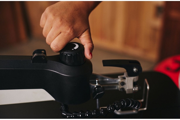 Станок оборудован параллелограммным механизмом привода качающейся части, имеющим ряд особенностей. Во-первых, верхняя часть рамы поднимается, что удобно при наладке или установке заготовки. В верхнем положении она фиксируется и не требует удерживания. Нижнее положение можно корректировать вращением рукоятки, подстраивая под длину пилки и толщину детали. Во-вторых, предусмотрен режим работы с продольной подкачкой полотна (так называемый маятниковый ход), который обеспечивает более «агрессивное» и производительное пиление. В зависимости от требований к скорости, точности и чистоте распила настраивают амплитуду продольных движений в диапазоне от нуля и до максимальной величины. Процедура выполняется поворотом моторного модуля вокруг оси.