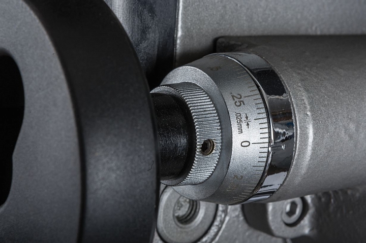 Моторная группа станка имеет мощный асинхронный двигатель - 1,5 кВт, имеющий функцию реверса. Благодаря реверсу шпиндель может вращаться вправо и влево. Наличие ременной передачи с концевым выключателем, позволяет выполнять обработку в 12-ти скоростных режимах. Частота диапазона вращения шпинделя составляет 125-2500 об/мин. Крестовый стол с 3-мя Т-образными пазами шириной 16 мм, позволяют выполнять установку дополнительной оснастки. Рабочий стол оснащен прецизионным механизмом.