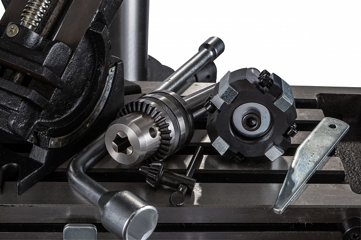 Вес станка в снаряженном состоянии составляет 290 кг. Станок комплектуется лампой освещения, торцевой фрезой диаметром 75 мм и сверлильным патроном.
