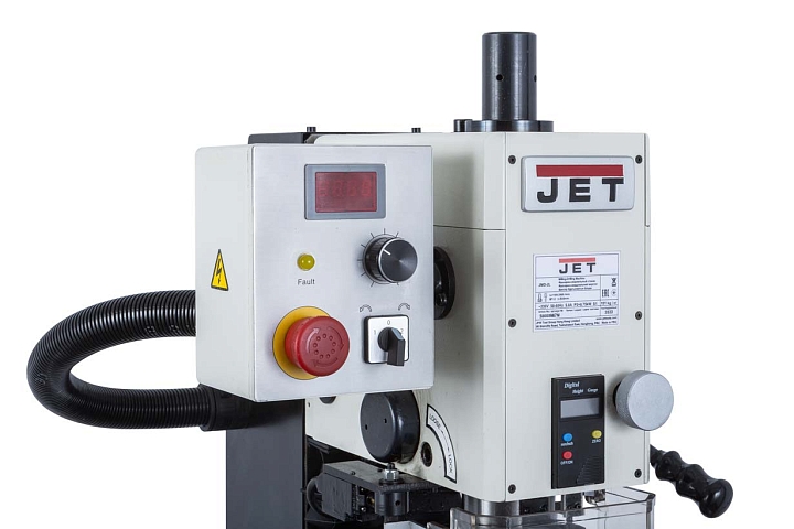 Моторная группа станка JMD-2L представлена коллекторным двигателем мощностью 750Вт. Управление работой двигателя осуществляется с панели управления, расположенного с левой стороны сверлильной головки. Двигатель имеет плавную регулировку частоты вращения. Диапазон частоты вращения составляет 100-2000 об/мин и регулируется потенциометром. Включение реверса осуществляется переключателем стороны вращения шпинделя.
