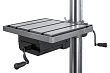 Станок имеет чугунное основание размером 580 х 430мм, в котором предусмотрены 2-Т образных паза для закрепления заготовки прихватами или другими зажимными приспособлениями. На основание установлена толстостенная колонна с зубчатой рейкой для возможности перемещения стола по вертикали. Рабочий стол, как и основание, изготовлен из качественного чугуна, его размер 455 x 405мм с 3-мя Т-образными пазами шириной 14мм.